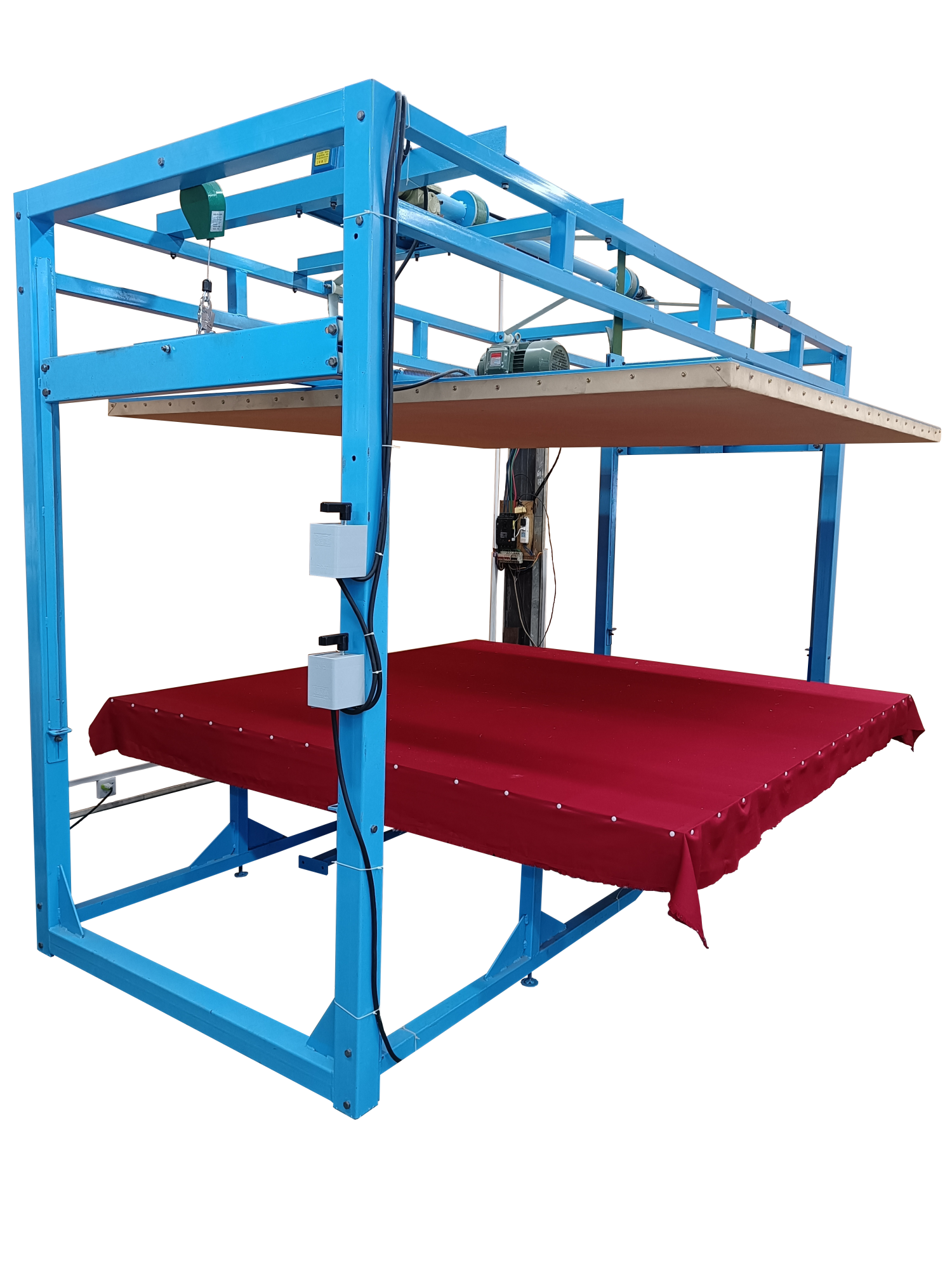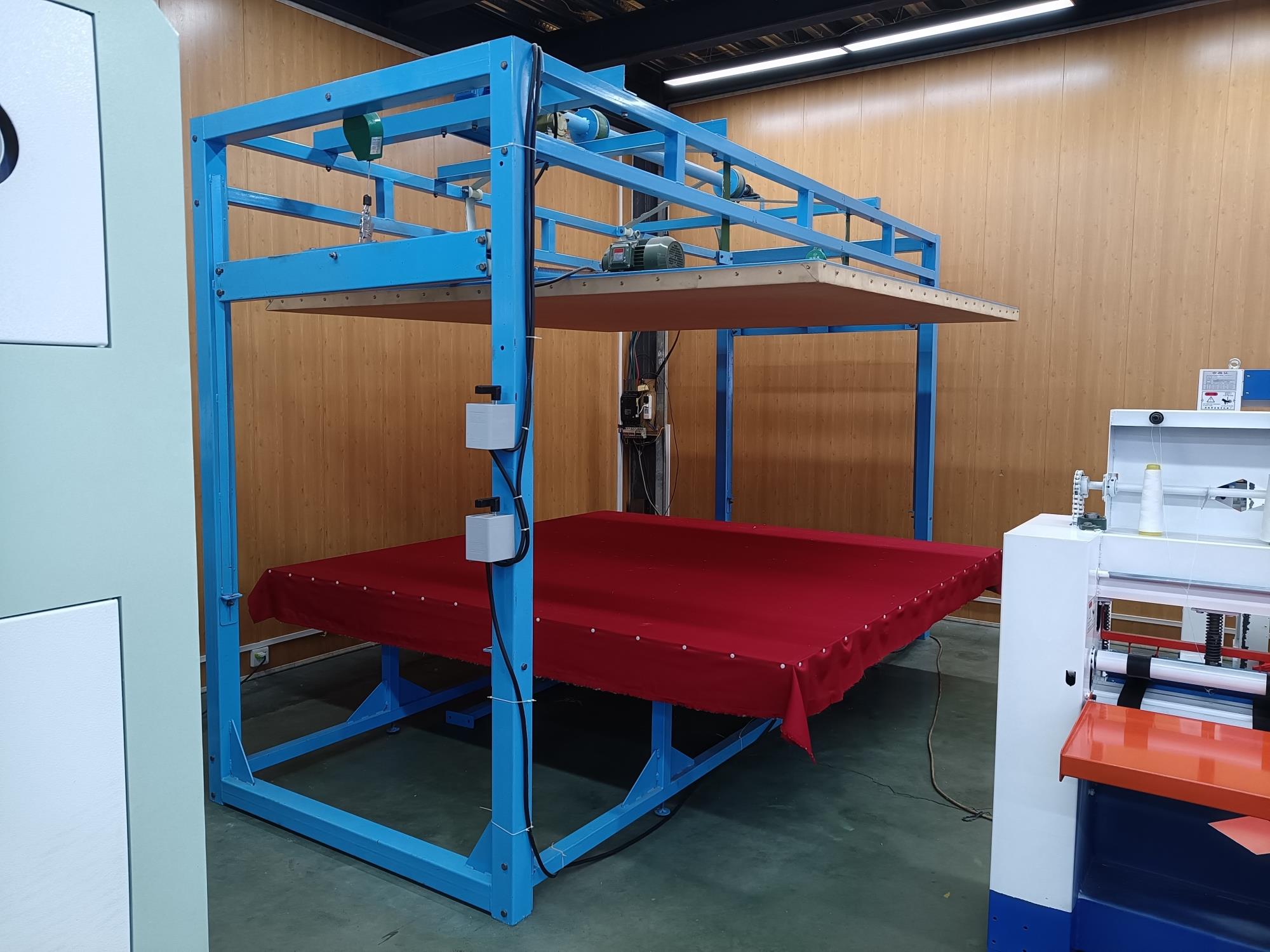 本全自動揉棉機為徽星機械機械制造有限公司研發新型產品,該全自動揉棉機由傳統的上傳動方式,改為下傳動方式。上傳動全自動揉棉機的主要缺點是噪音高,振動副度比較大,安裝時要配合地錨來固定機器,本新型機器(全自動揉棉機)的下傳動裝置改變了以上的缺點。新一代全自動揉棉機(揉磨機)操作方便,易于使用。適用于棉胎成型加工廠、踏花被廠、棉胎加工個體戶使用;全自動揉棉機揉制的棉胎(絮)平整、美觀、結實、耐用,全自動揉棉機(揉磨機)使傳統的人工強體力勞動變為本系列機器的自動化機械作業,特別是自動升降系統和定時揉棉設定,大大減輕了工人的勞動強度、提高了勞動效率。并且一人可看管多機,效益非常顯著。全自動揉棉機其原理是電機帶動偏心運轉使上揉板運動,將棉鋪磨平、壓緊,使棉纖維與網線結合,成型棉胎。